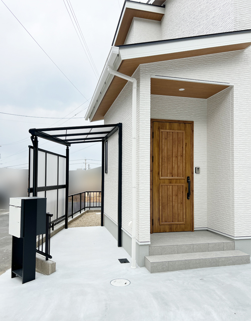 玄関には宅配ボックスが設置され、自転車置き場(サイクルポート)も施工されています。