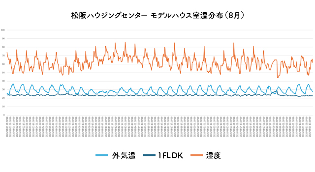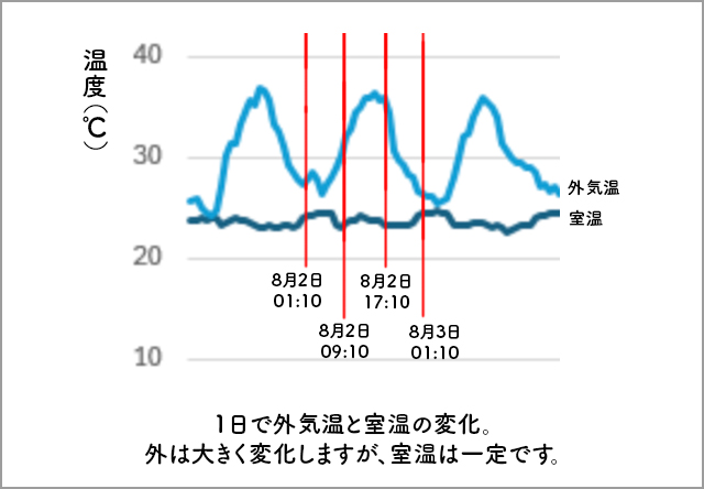 今年の8月、外気温は1日の中で大きく上下していたのに、1階リビングの室温はほぼ一定に保たれていたのです。