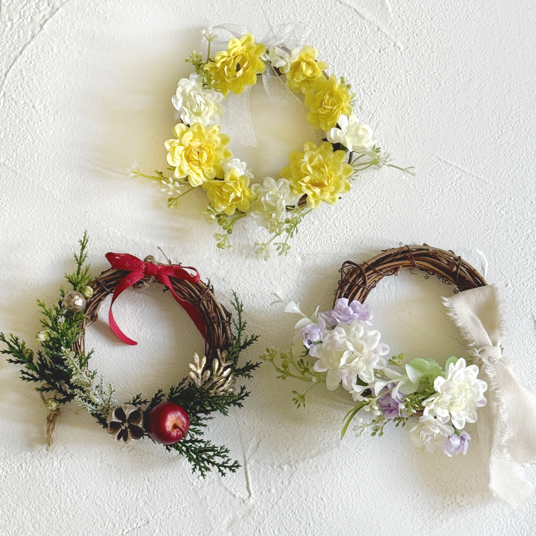 高品質な造花「アーティフィシャルフラワー」を使って、直径約10cmのかわいいリースをお作りいただけます。