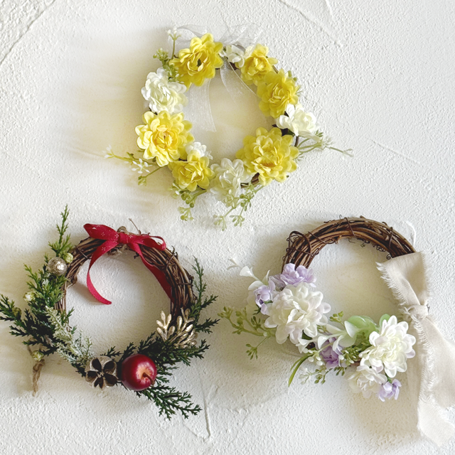 アーティフィシャルフラワーを使ったかわいいリースは、これからの季節、クリスマスの飾りとしてもぴったり!