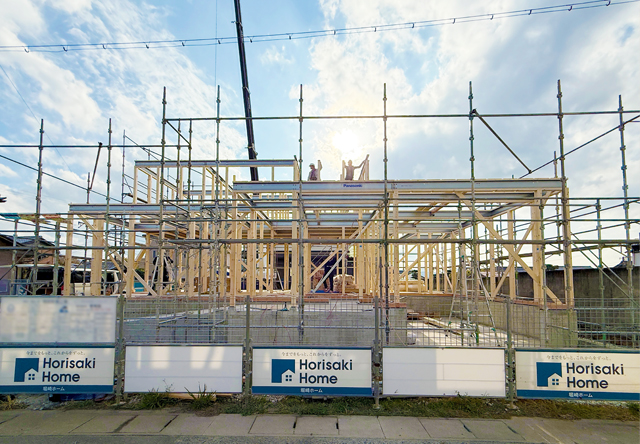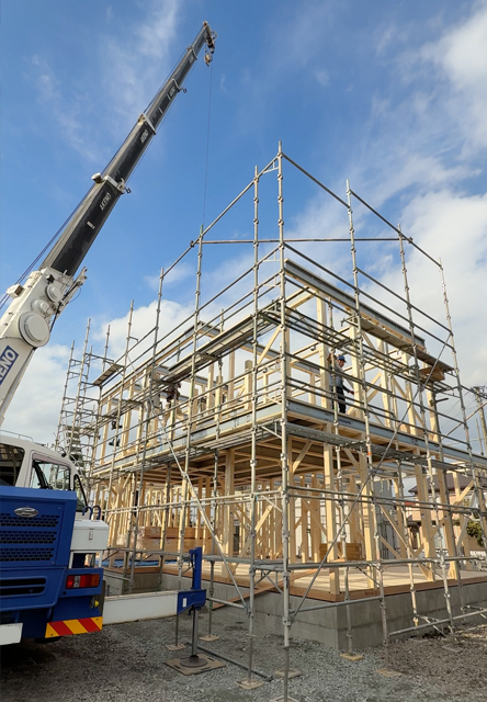 クレーンで2階部分へ梁などの資材を運び入れ、それを経験豊富な堀崎ホームの職人さんたちがスピーディーかつ正確に設置していきます。