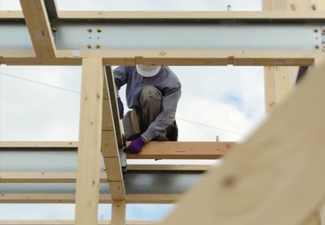 木造住宅の弱点になりやすい「梁」の部分に、木の梁×鉄の補強材(テクノビーム)を組み合わせて強度を高めた、Panasonic独自の耐震工法です。