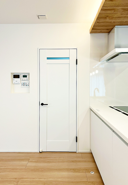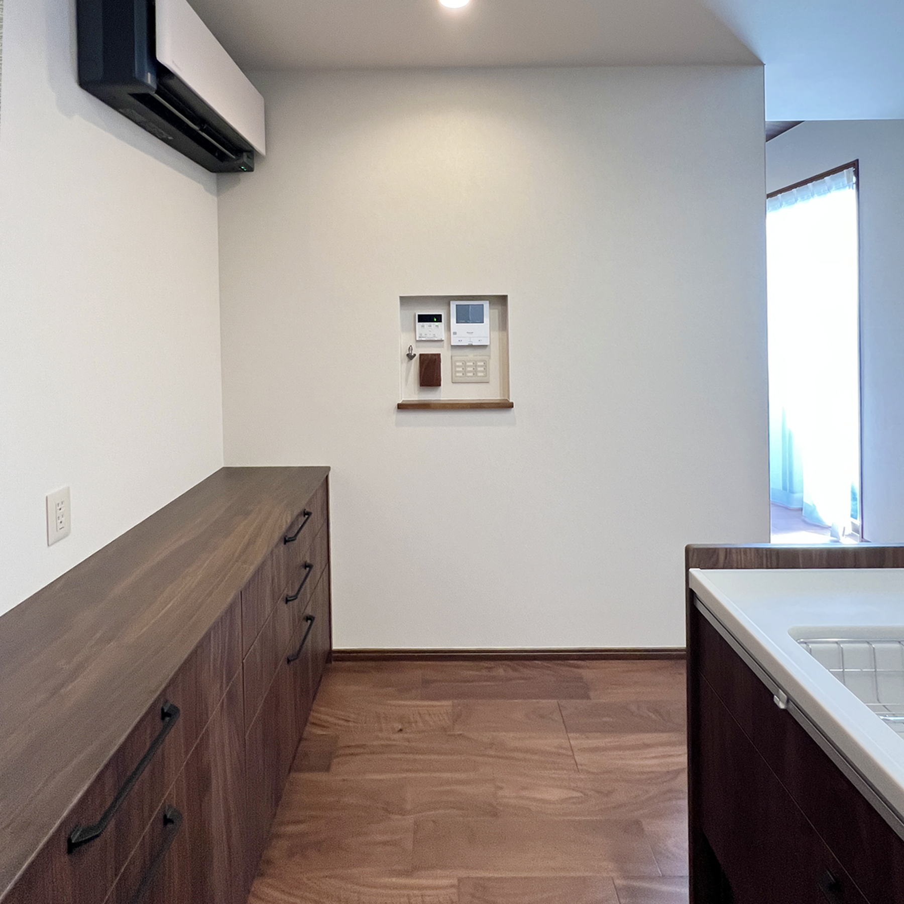 キッチンの後ろ側に設けたニッチにも、ドアホンや各種操作パネルを集約しています。