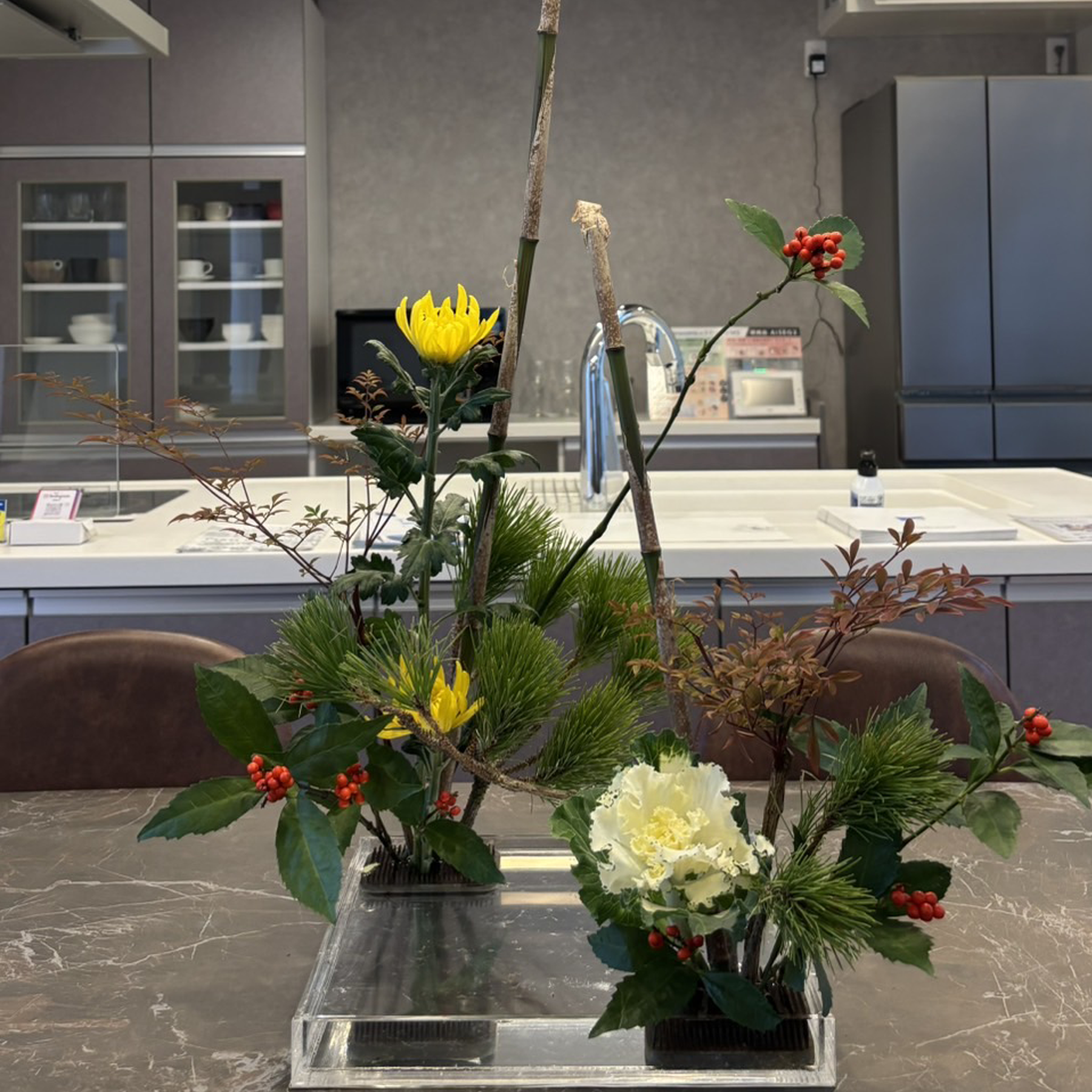 堀崎組の本社玄関には、お正月の生花が飾られています。