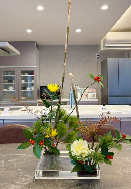 松阪のモデルハウスにも、華やかなお正月の生花を飾り、