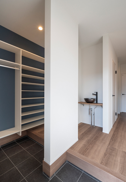 玄関には造り付けのベンチと大容量のシューズクロークを配置し、さらにセカンド洗面台を設けることで、