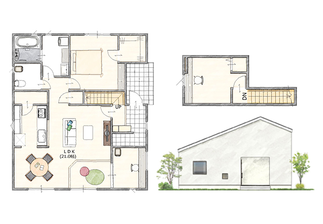 平屋のように1階で生活が完結しながら、2階には約5帖の個室を設けました。