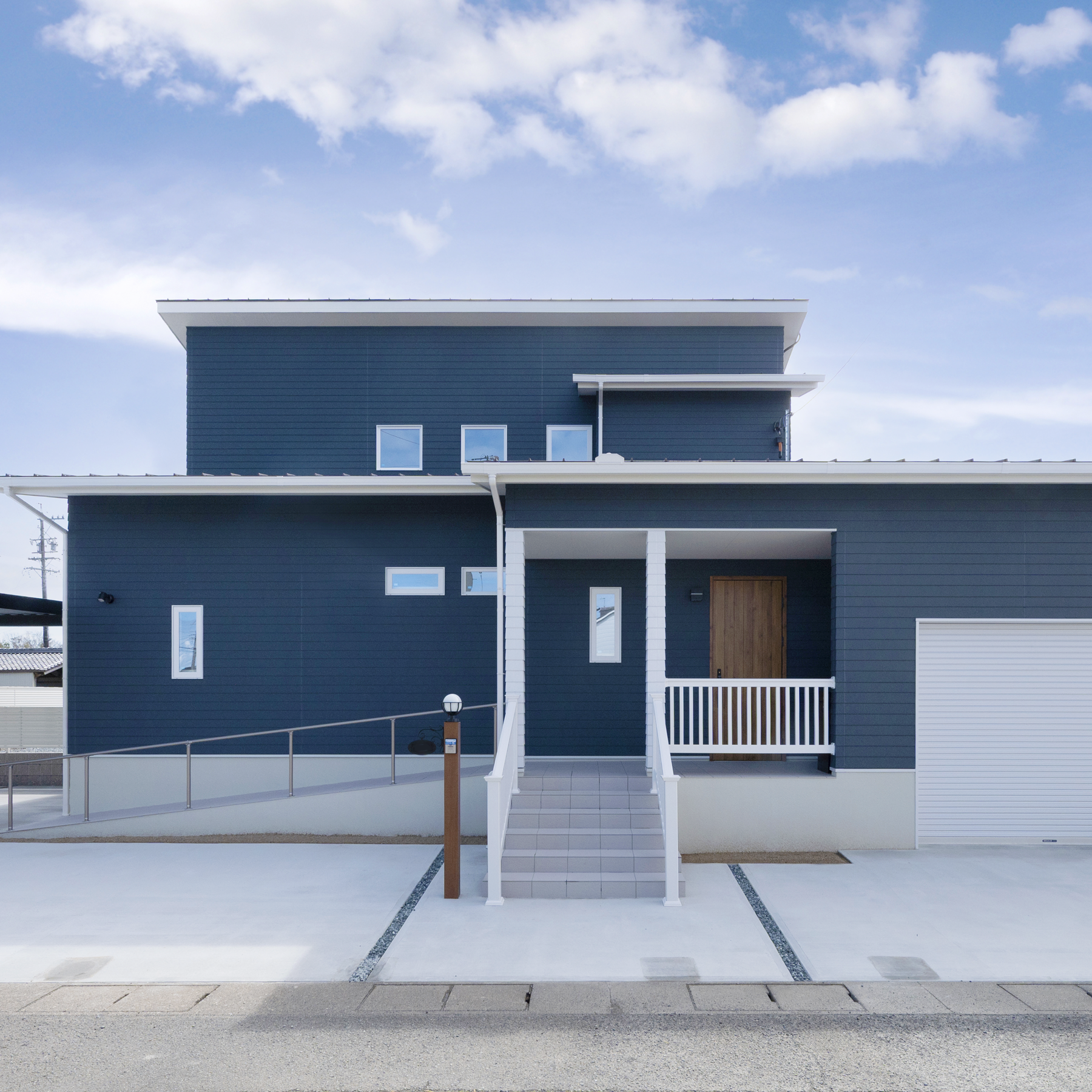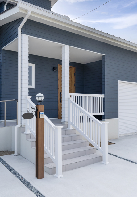 青と白を取り入れた、カリフォルニアスタイルのおしゃれな外観。