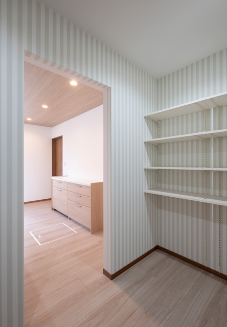 インナーガレージからの動線は、パントリーを通ってキッチンへ。