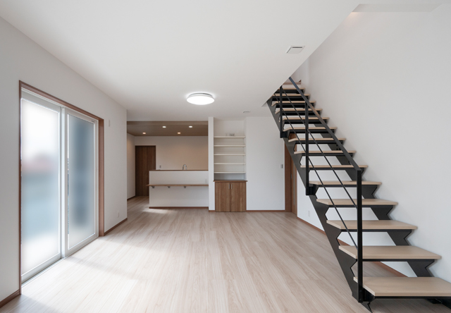 リビングには、印象的な鉄骨階段を設置。