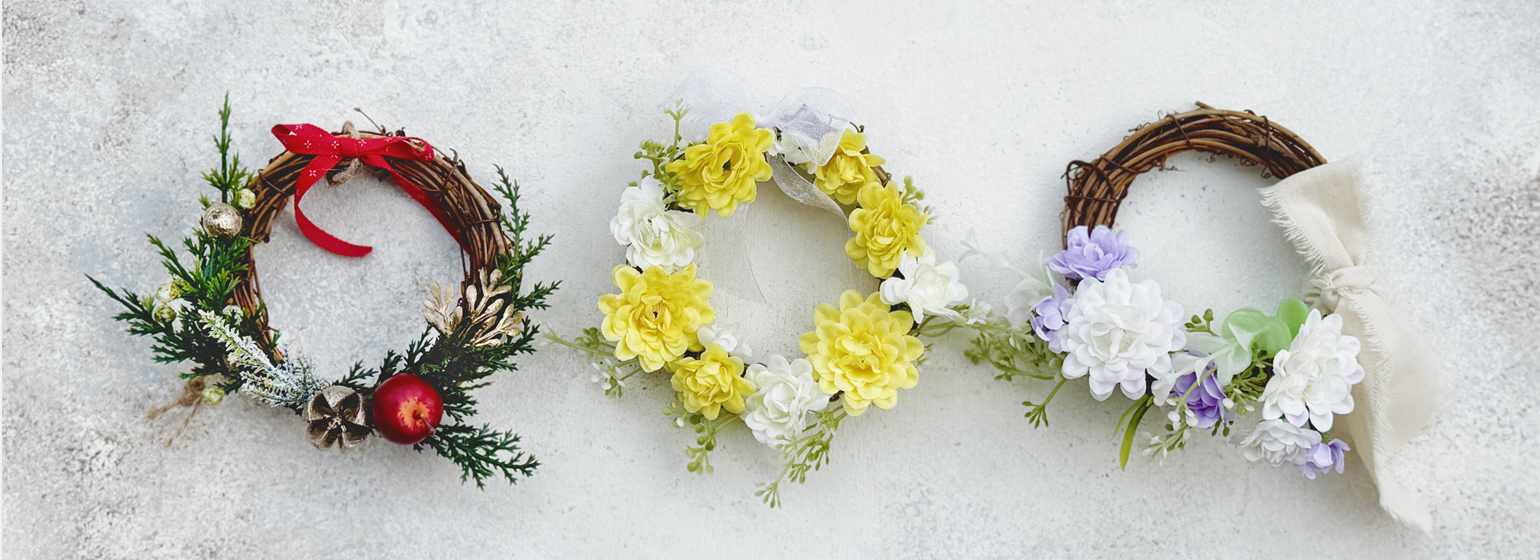 これからの季節にぴったりな、クリスマスのミニリース(直径約10cm)や、季節を問わず飾れるアーティフィシャルフラワー(高級な造花)のミニリースを作ってみませんか?